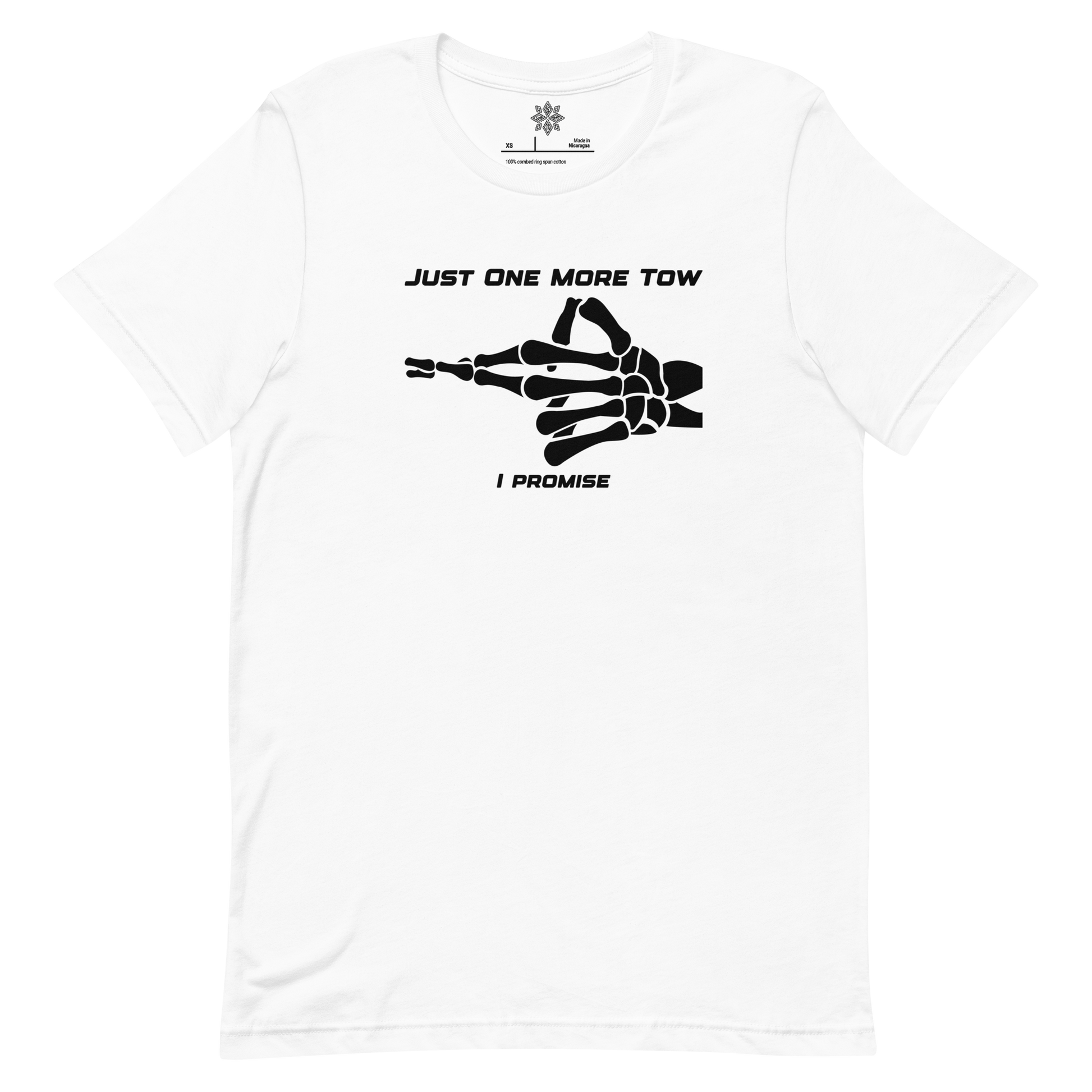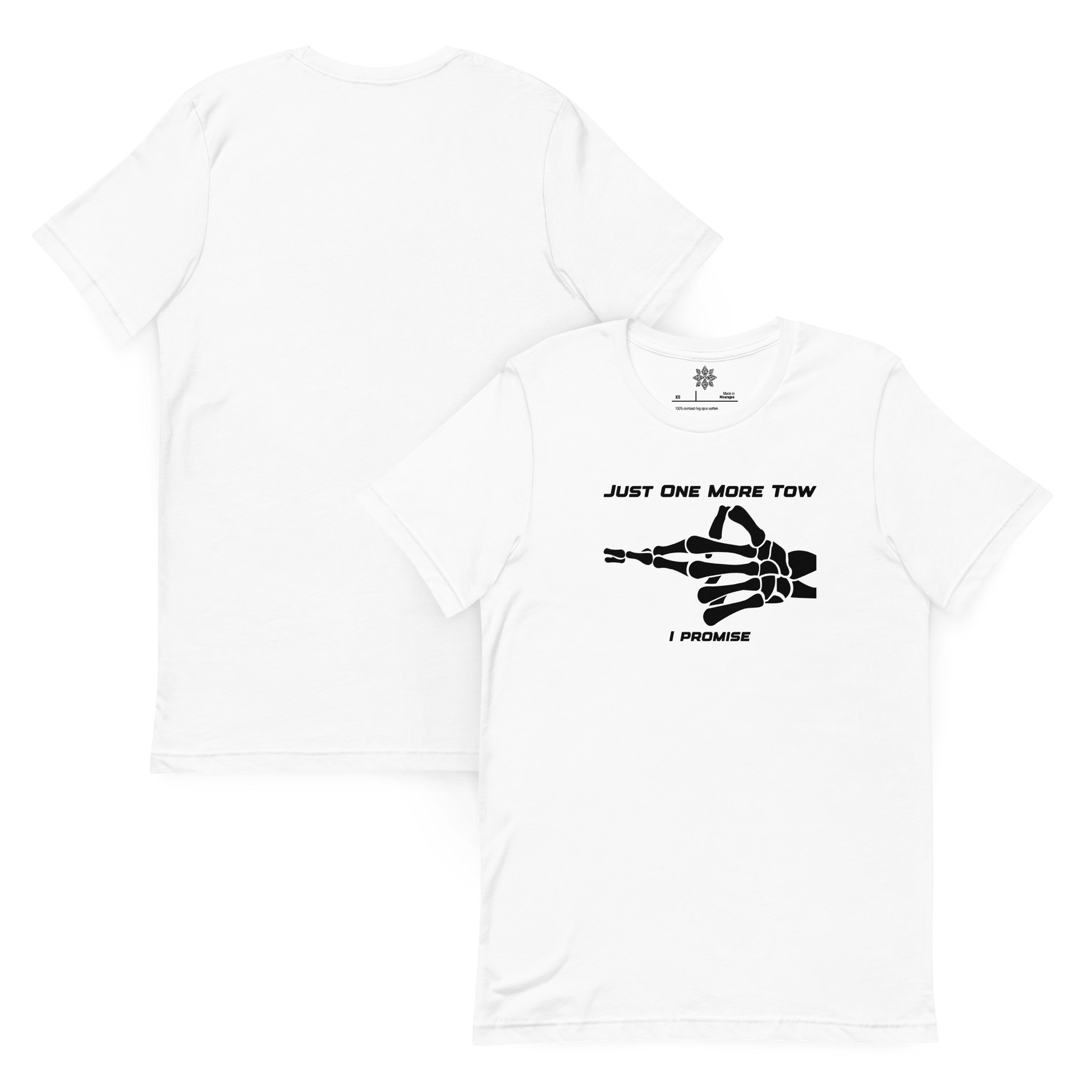 Some things in towing never change… like saying “just one more” when everyone knows it won’t be the last. This shirt captures the life of a tower with a sarcastic twist — bold lettering frames a skeleton hand with fingers crossed, the universal sign for promises we probably won’t keep.