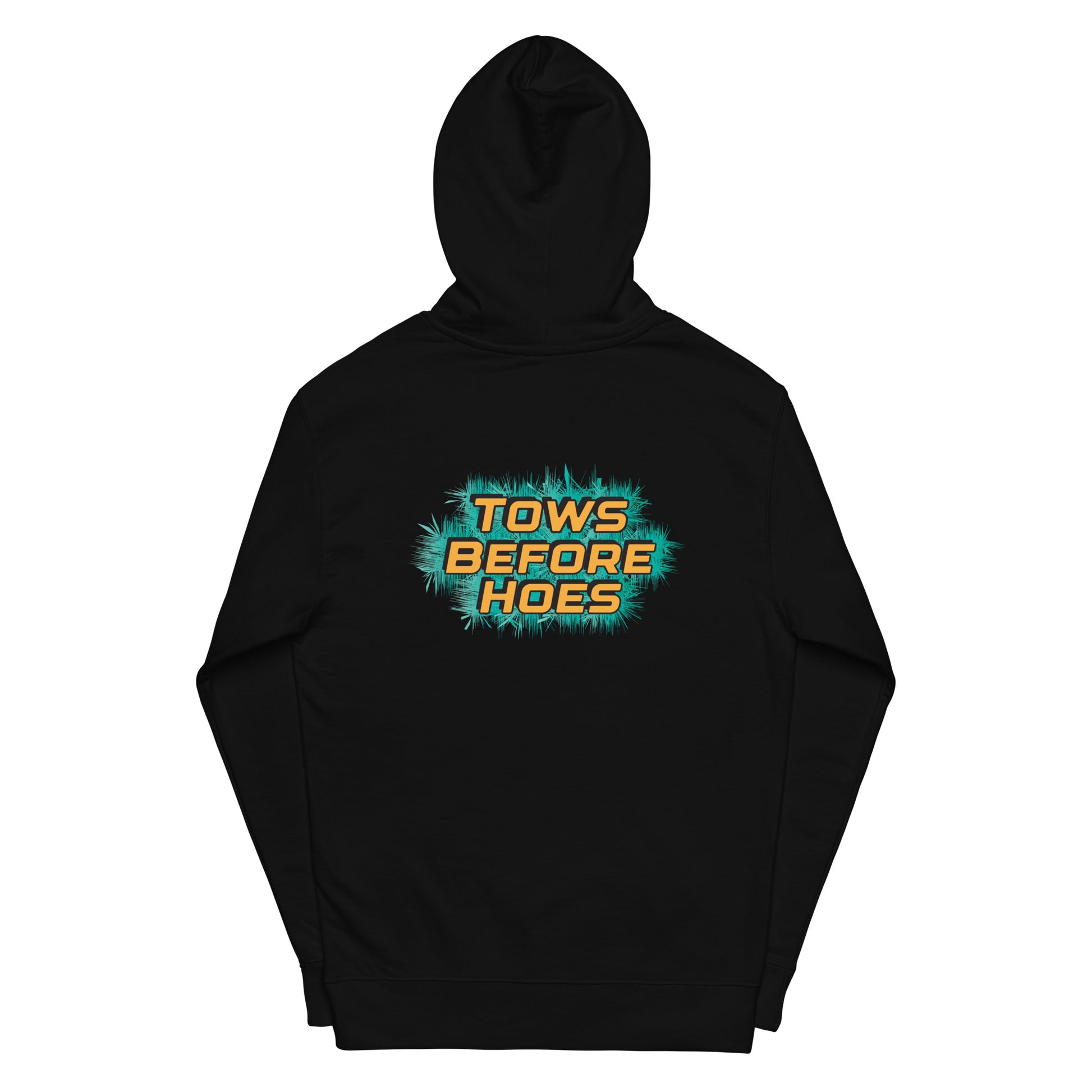 Make a bold statement with the "Tows Before Hoes" T-Shirt, a humorous and spirited tribute to the dedication of tow truck operators. This shirt blends humor with appreciation, making it a perfect choice for those who understand the importance of prioritizing responsibilities.