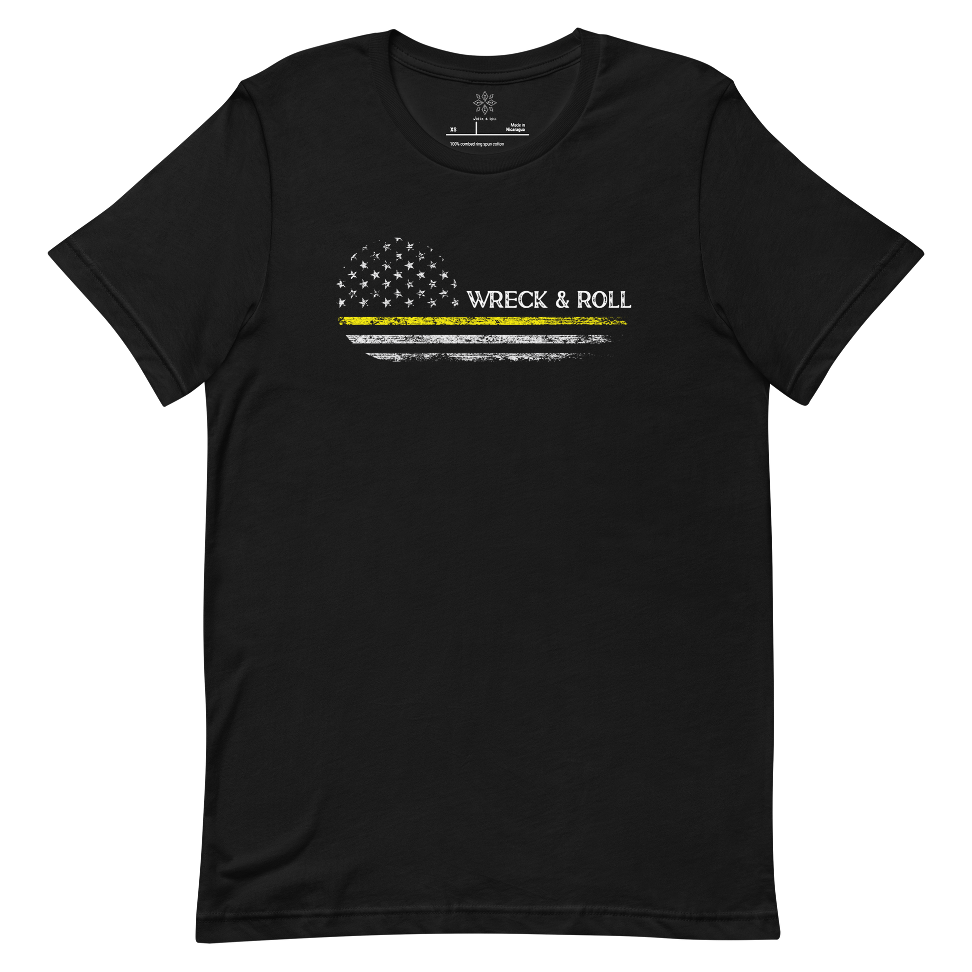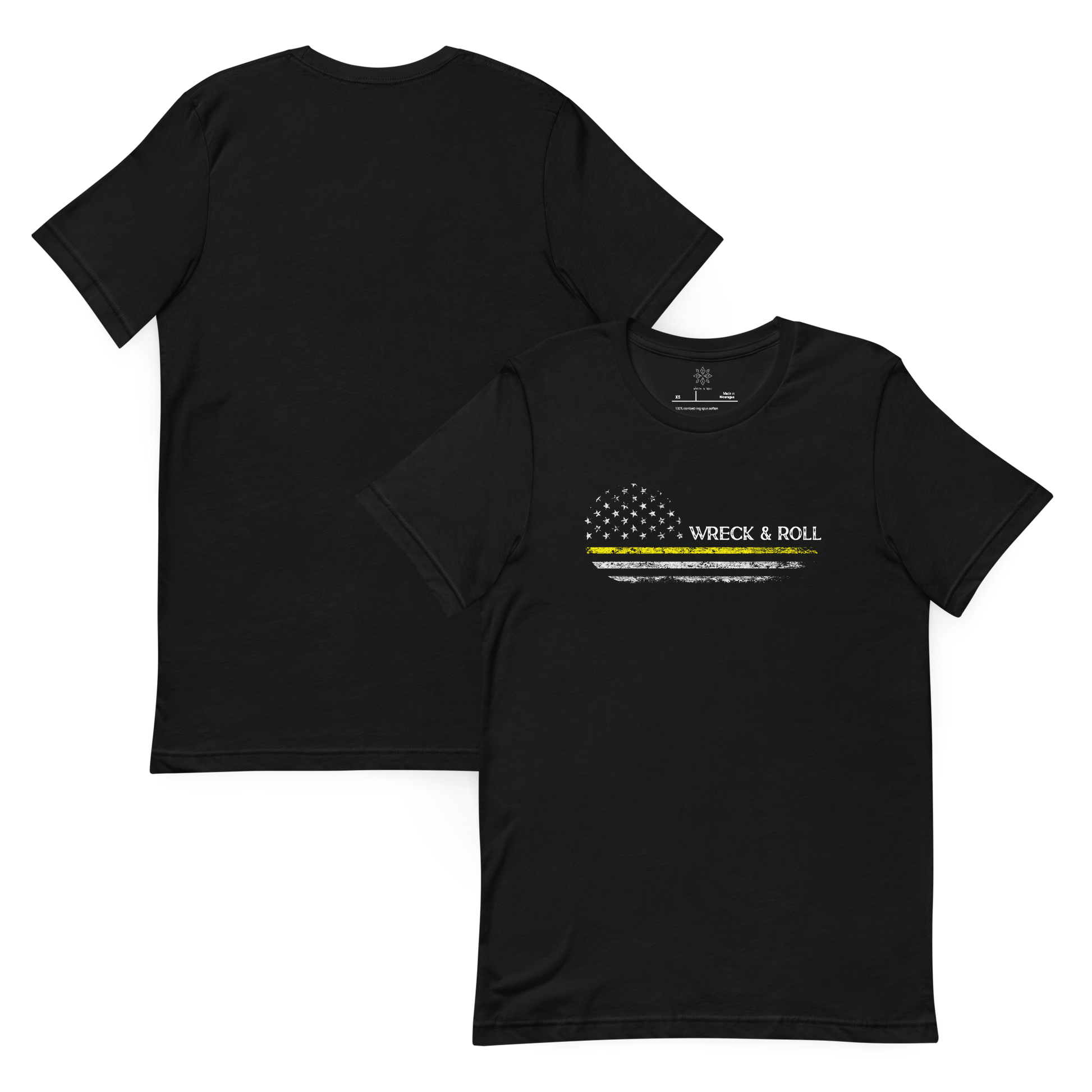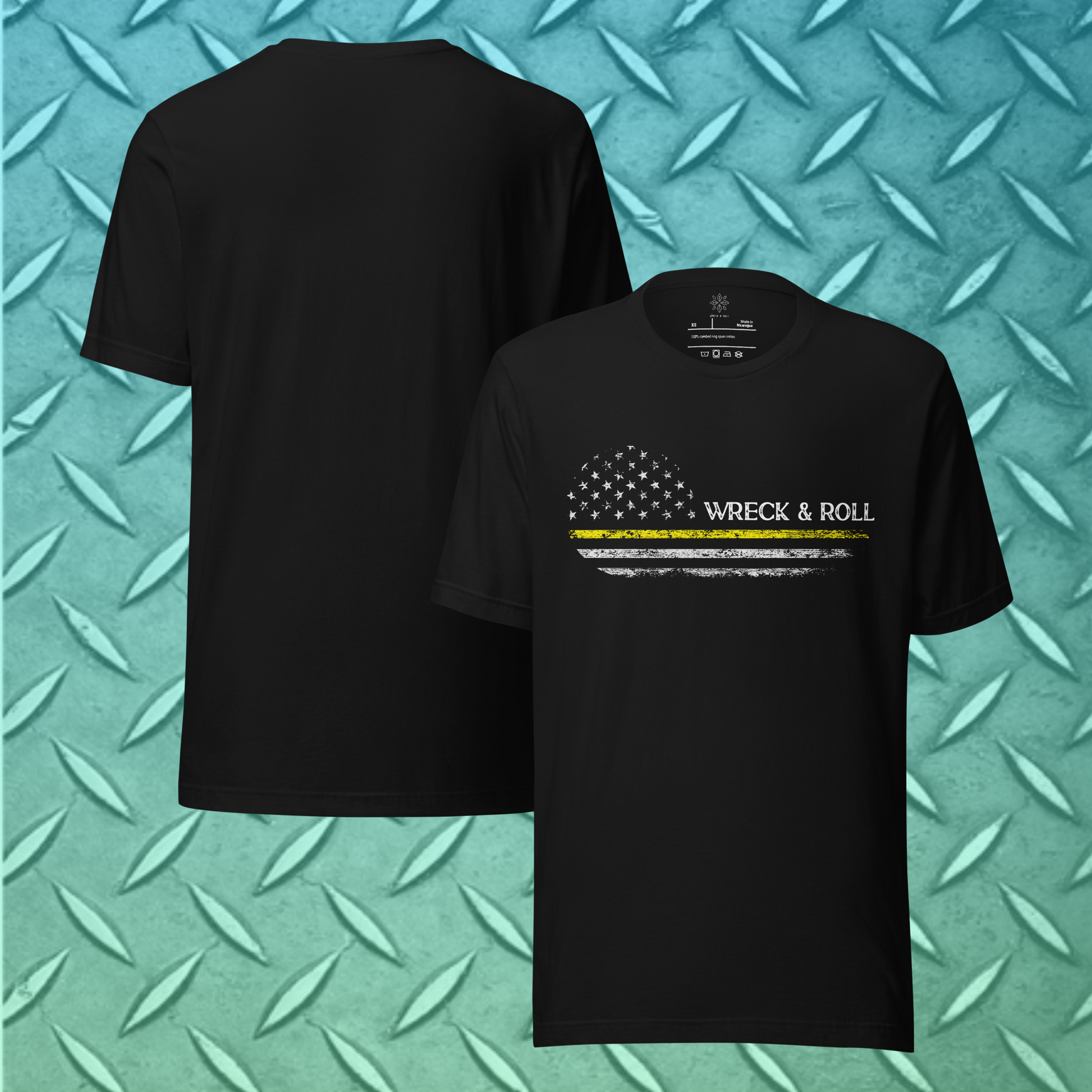 Show your pride and stand tall with our Yellow Line Strong tee. Featuring a rugged, distressed American flag with the bold yellow line across the center, this design represents strength, honor, and the towing community’s commitment to keeping the roads safe.